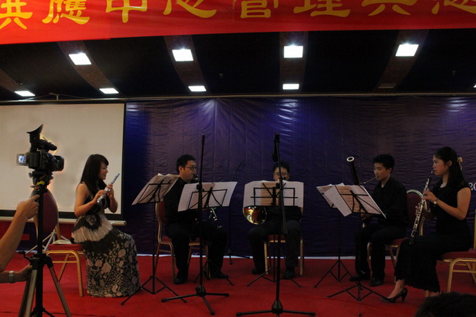 美国鲁沃夫中国培训中心室内乐团为晚宴献上了管乐五重奏(步步高、威尼斯狂欢节、半个月亮爬上来、演艺人、女兵舞、远方的客人请你留下来)、小提琴独奏(梁祝、梦幻曲)和女声独唱(但愿人长久)等节目。