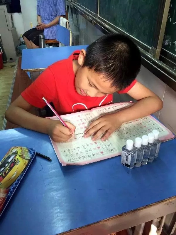 一位安置点的小朋友正在聚精会神的写作业