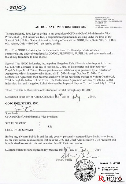 美国GOJO公司正式授权书