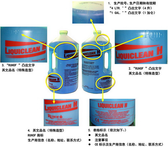 面朝握把,左侧瓶身下方印有表格标示,每行内容为:a)英文品名 b)注意事项c) CE标示及生产商信息(名称、地址、联系方式);右侧瓶身下方印有英文品名(特殊造型)、RUHOF英文商标和生产商信息(名称、地址、联系方式);